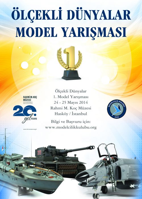 Modelcilik Kulübü Derneği ve Rahmi M. Koç Müzesi işbirliği ile “Ölçekli Dünyalar, 1.Model Yarışmasını” 24-25 Mayıs 2014 tarihinde siz değerli modelcilerin katılımı ile gerçekleştirmiş bulunmaktayız. Yarışmamıza yurt içinden başta İstanbul, Ankara, İzmir olmak üzere Bursa, Kocaeli, Kırklareli, Kütahya, Tekirdağ ve Edirne’den ve yurtdışından da Bulgaristan (Sofia, Svilengrad ve Varna), Yunanistan olmak üzere toplam 150 katılımcı 575 model ile iştirak etmişlerdir.Ülkemizde yapılan yarışma ve sergiler genelde branşlara (uçak, askeri kara araçları, sivil araçlar, gemi ve figür vb.) özgü olmasından dolayı bu güne kadar maalesef tüm modelcilerin (model dallarının) iştirak edebileceği organizasyonlar yapılamamış olup, modelciler arasında gerekli iletişim ve birliktelik sağlanamamıştır. Organizasyonun tamamı Kulübümüz ve gönüllü modelciler ve üyelerimiz tarafından yapılmış olan “Ölçekli Dünyalar, 1. Model